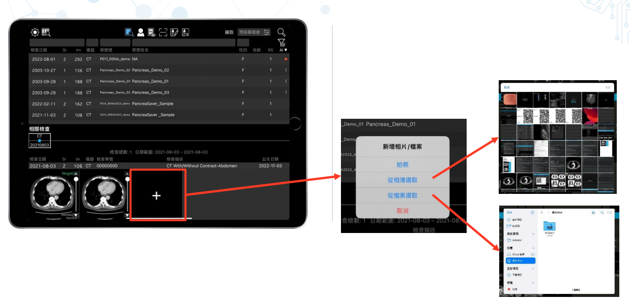 1. 支持拍照, 相簿,档案(JPG,PNG,PDF)上传,适用于急诊数据上传、卫教信息分享等应用;