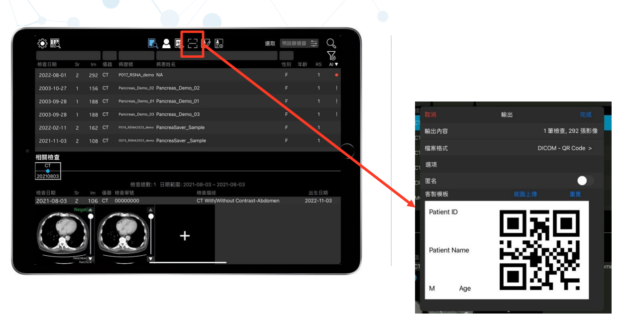2.支持检查影像分享,可通过QR Code,AirDrop方式。影像可转成JPG、PNG格式;